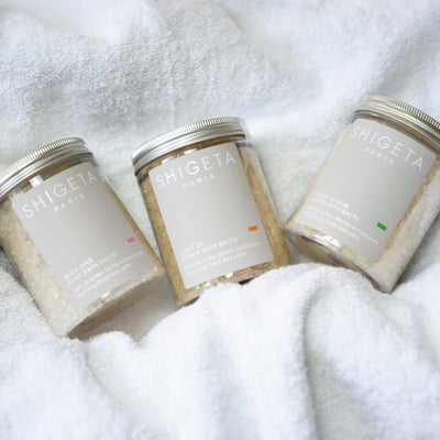SHIGETAのバスソルトは、ミネラルが豊富な死海の塩に、さらに厳選した植物のエッセンシャルオイルをブレンド。豊かに立ち上る厳選した植物の香りを楽しみながら、至福のバスタイムをお過ごしください。