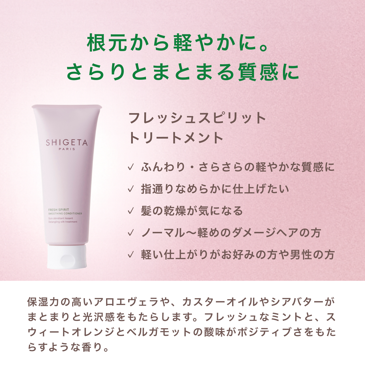・重さを残さず、髪本来の柔らかさと自然なツヤを引き出すトリートメント ・保湿力の高いアロエベラやシアバターがしっとりとしたうるおいを与える・カスターオイルやブロッコリー種子油が自然な光沢とシルクのようななめらかさをプラス ・ミントとベルガモット、スウィートオレンジの清涼感で、前向きな気分へ導く、みずみずしい香りこんな方におすすめ