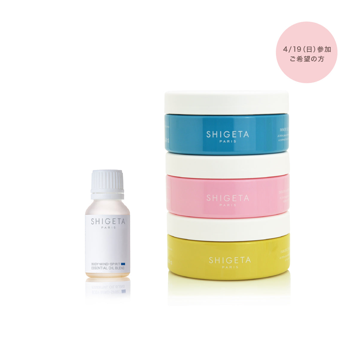 ・インナーハピネス:海塩、ベルガモット果皮油、オレンジ果皮油、マンダリンオレンジ葉油、ニオイテンジクアオイ花油、ダマスクバラ花油、クスノキ木油、チョウジつぼみ油、ショウガ根エキス、ニュウコウジュ油、トコフェロール